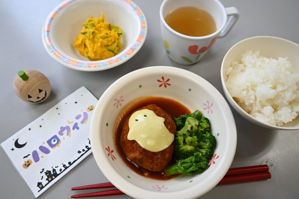 今日はハロウィンですね。みなさん仮装したりしていますか?私は、普段から仮装していると言われるので、あまり変わらないですね…。そんな楽しい本日のお昼ごはんは”煮込みハンバーグ”です。よーく見ると、おばけが…。ちょっと可愛いですね。そんなハロウィンを食べても楽しめるのは良いですね。(トリックオアトリート)
