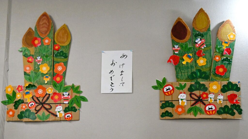 年末に作った門松でお正月を迎えました。文字も書いてもらい、これはこれで素敵な雰囲気で楽しいお正月です。今年もいろんな作品を作って、施設の中に居ながら少しでも季節を感じてもらえたらと思います。