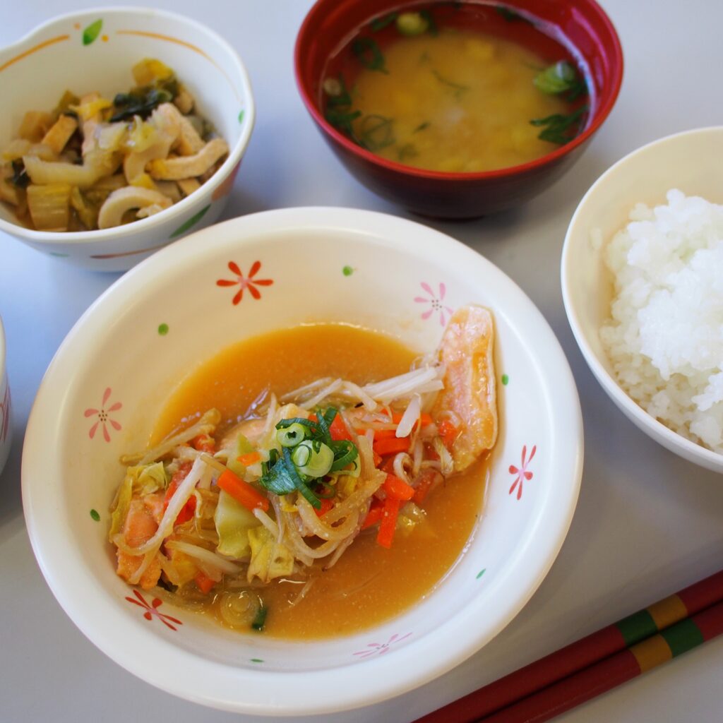 今日は風が強いですが、晴れています。明日から雪との予報ですが…。そんな冬だとは思えない天候の日のお昼ごはんは”鮭のちゃんちゃん焼き”です。お味噌の風味が鮭と相まって美味しい料理ですね。ご飯にも良く合う味付けで、みなさんも美味しいと残すこともあまりありませんでした。(ちゃんちゃん)