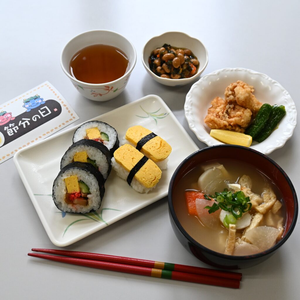 鬼は外。福は内。そうです。本日は節分。みなさんも豆まきしていますか?最近は豆まきするのでしょうか…。最近は歳の数(+1?)だけ豆を食べるのでしょうか…。昔ながらの風習も消えつつあるように思いますが、その一方で恵方巻を食べることは全国に広がっていますね…。ということで、本日のお昼ごはんは”太巻きとたまご寿司”です。やっぱりそうなりますよね。いつから恵方巻を食べる様になったのか記憶に無いですが、美味しいから良いですね。ご利用者さんもお寿司は好きだと笑顔でした(赤鬼青鬼)