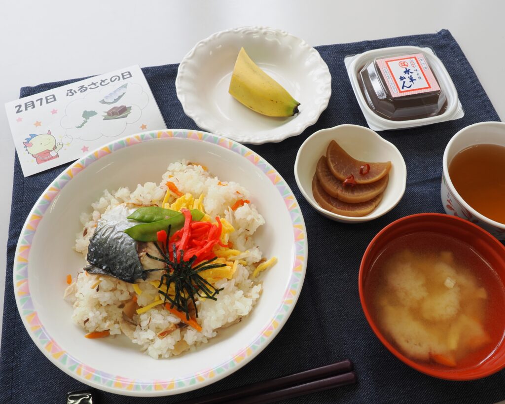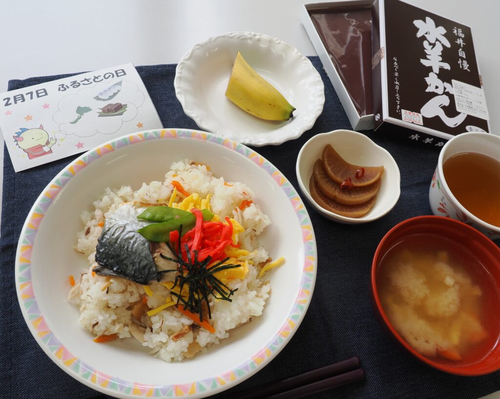 今日は雪が降るのかな…思っていたけど、日差しもあり雪は来ず…。そんな本日2月7日は福井県のふるさとの日です。福井県が出来た日…。意外とと皆さん知らない方も多いですね。そして本日はふるさとにちなんだ料理がお昼ごはんに登場です。特に沢庵の煮物は自宅でも良く作られたようで美味しいと懐かしんでいました。(越前若狭)