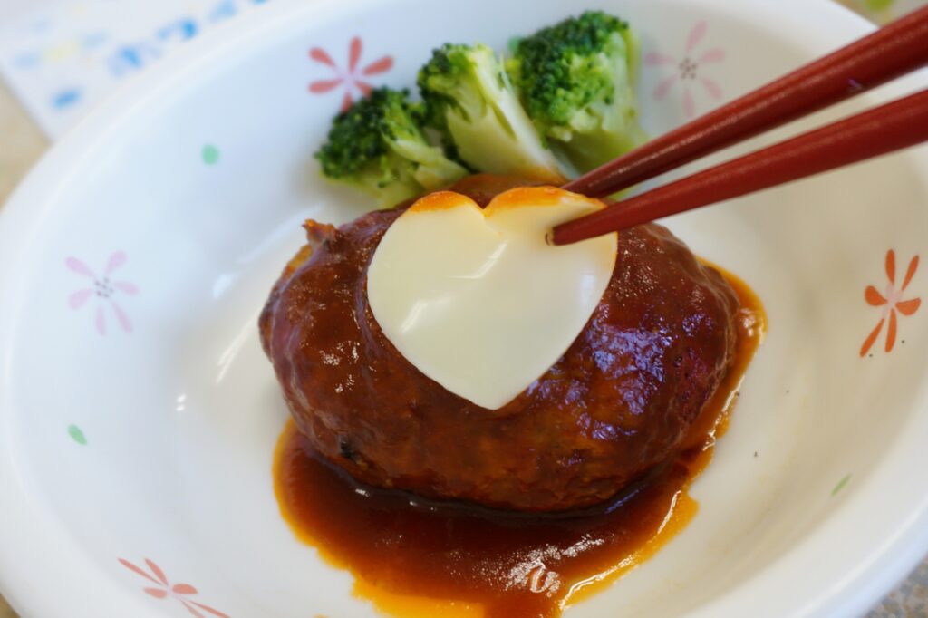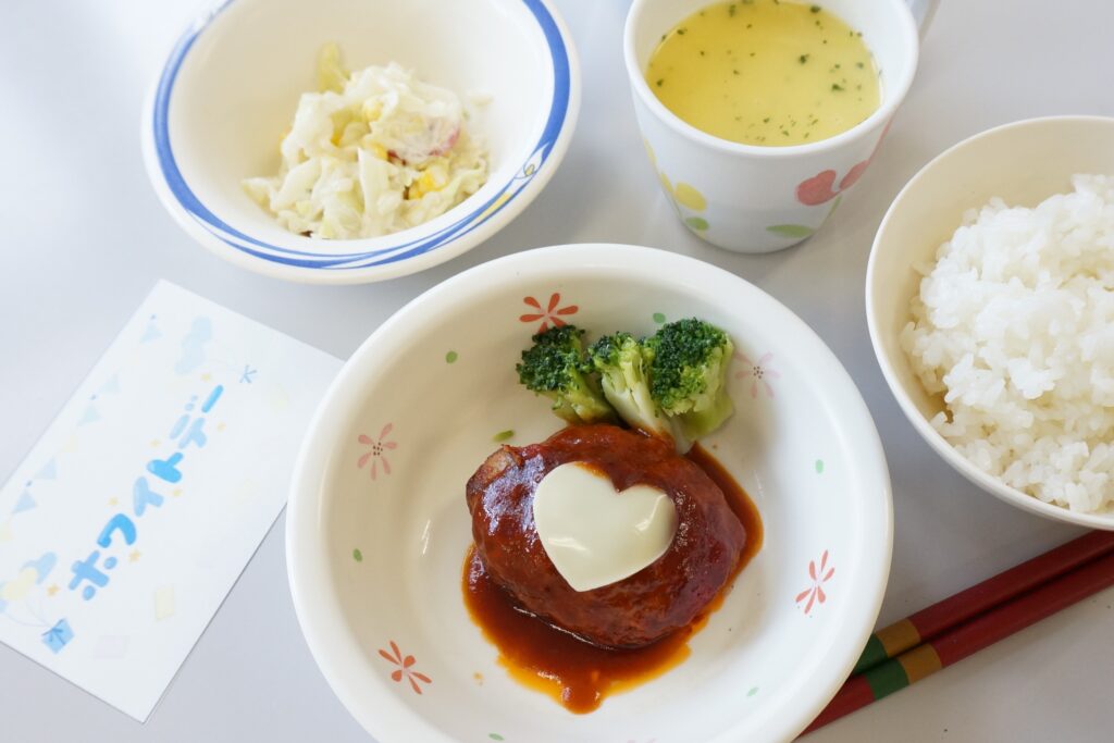 なかなか春らしく暖かい日にならないですね…。そんな3月の半ばとなる本日は、ホワイトデーです。今日のお昼ごはんもホワイトデーにちなんだ料理…。そう”煮込みハンバーグ”です。よーくみるとハートがトッピング。ちょっと口の周りに美味しそうなソースが付いているようですが、その表情は美味しさで笑顔となっていましたよ(ホワイトソース)